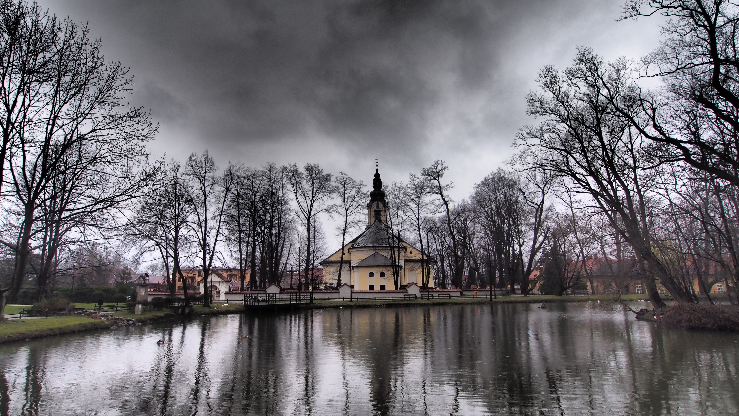 I kept walking and passed through a park in the middle of the city. It borders a church whose spire towers over many buildings in the area save for the factory chimneys further back. This park is lush and green in the summertime and an impressionist painting of it hangs on my parent’s wall.