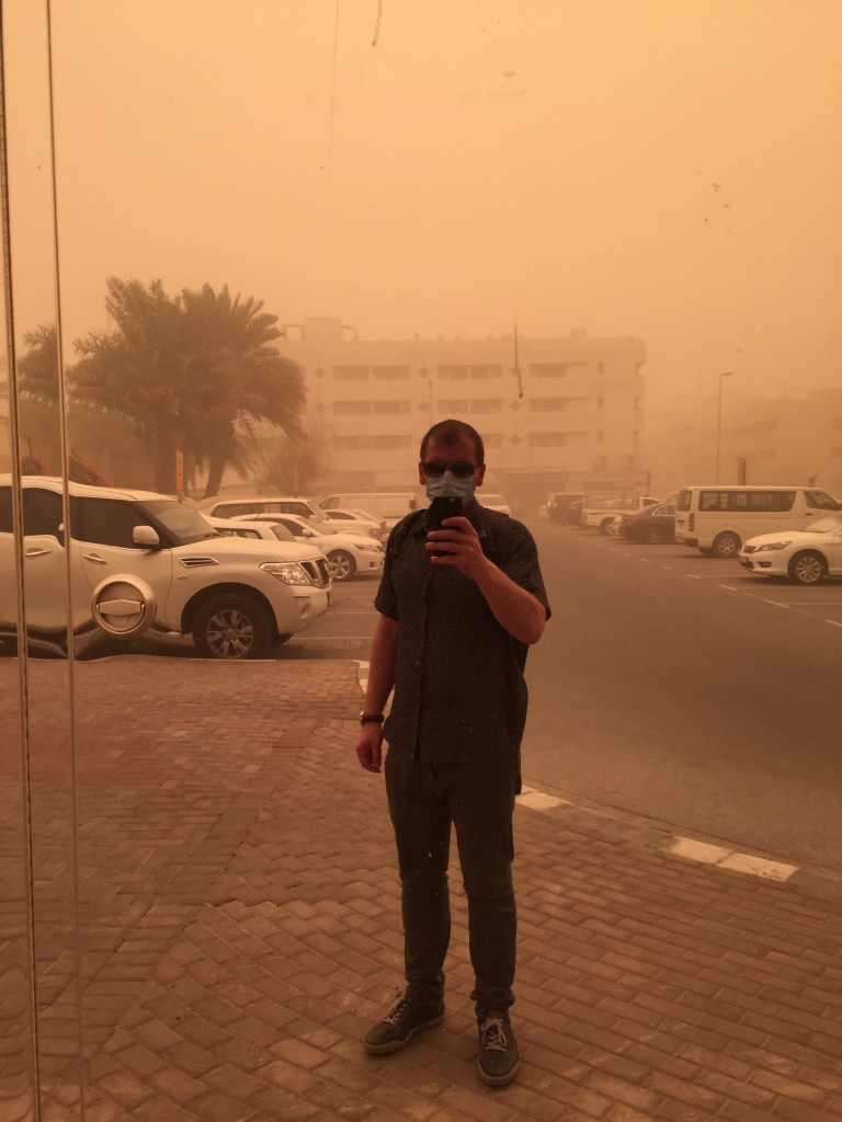 I got into the front train so that I could see the route and do a bit of sightseeing. I looked at the seats and thought of how luxurious it all was. These were like airplane seats with a nice headrest. I did spot some poor design though. The sighn announcing the next stop was behind a small display so no one could see the writing. The train slowly filled in as it got closer into the city. When I finally got to my stop I realized why this car was so nice, it was the first class section. The other cars were filled with people as I walked by towards the exit. The next part involved bussing it to a stop by the Iranian hospital where my hotel was. I’m not staying along the strip or any of the high end hotels. The hotel is still nice though. It happens to be the first hotel I’m staying at on this trip. I wanted to leave my bag and check in later so that I could have mobility during my exploration of the city. At the desk I learned that for a premium I could check in early. It was still a long time until the official check in so I went for it. In retrospect this was a great idea. I got a chance to clean up and unpack and take what I wanted with me. After having lunch I set off. The dust storm has been an ever present character throughout. I decided to get a mask and found a pharmacy where I could buy one.