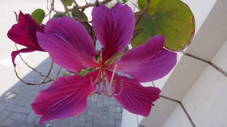 It was in recognition of walking 36590 steps! It used to take me two days to do that distance. I had to check out by eleven and had to do something before catching my flight to Mumbai that was leaving at 1845. I decided to have some breakfast and have a coffee somewhere afterwards. The day was sunny and hot. The skyscrapers provide shade and a cooling wind from the heat and the sun. I sat outside and wrote my story of the day before. I kind of enjoy doing this. It gives my travel a bit of a purpose and allows me to reflect on what has happened and how I could do better. I have learned things so that I can strategize better. Much of this trip is ad hoc as I find this kind of exciting and interesting. However much one can plan things to go a certain way things can be go completely different. It’s like not realizing that on Friday the prayers would result in many shops that I wanted to explore the ones with gold were closed. Sitting there also allowed me to check out the people walking by. To see the multitude of different people and tried to spot which ones lived here and which ones were tourists like me. While a lot were non-Arab I surmised that most of them actually lived here. Time quickly passed and I needed to go back and pick up my bag and make my way to the airport. I walked through a neighbourhood that seems middle class to me. Many of the houses had blooming flowers and I stopped to take photos of some of them.