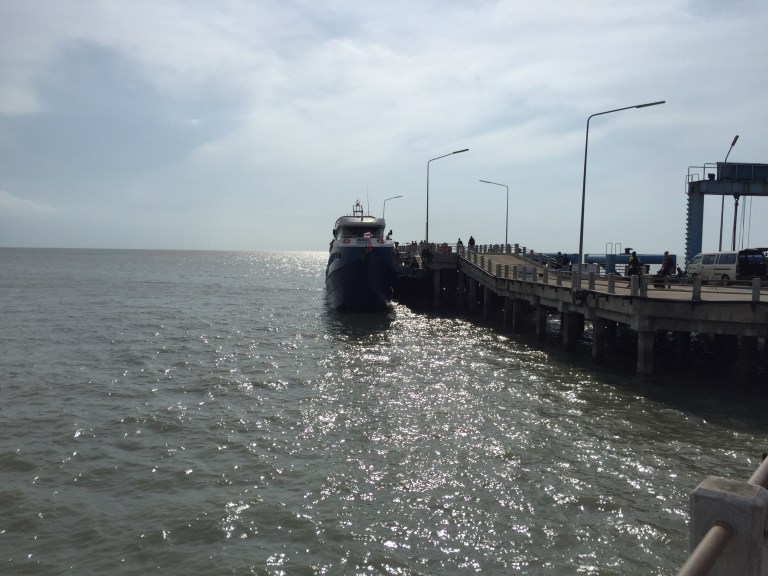 They rushed us off the bus and made us walk to the ferry. The walkway was covered protecting a bit from the sun’s warm rays. Some of the railings were rusted away with some replaced by bamboo stuffed into the holes left behind by the steel poles. I passed a woman strolling along eating ice cream as she rolled her bag down the concrete sidewalk. Our ferry was the last one. It’s an older looking ship not as sleek as the catamaran in the other dock being loaded by passengers eager to get to their destination. I carried my bag and wondered what I will send back to make it lighter. Everything doesn’t fit as well as it once did. It’s not because I bought a lot it’s just that I need space to make packing less of a chore. Once on the ferry our baggage was nearly stacked with everyone else’s together in one place. The ferry is fairly packed with people. We alternated getting Drinks and as I stood outside to take some photos I chatted with a lady who happened to be from South Africa. We both agreed that the last bus ride was way too long. It’s probably going to take forty-five minutes to make it to the island and maybe another forty-five to make it to the hotel. All in all a lot longer than we thought it was going to take.