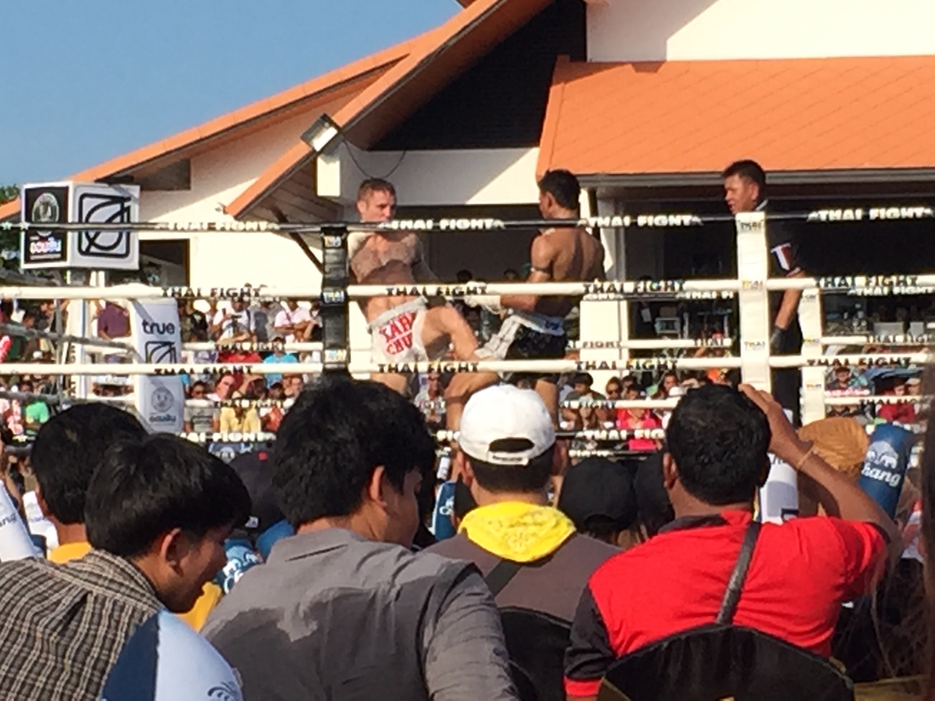 We had a few beers before going to the event. The doors were opening at 1500 and as we discovered they were first come first serve. We found the spot we wanted to sit in and waited until we could sit there. There was an order to how they filled the seats. There was time before the fights started and the sun caused perspiration to swell to the surface of the skin. We were all suffering but enjoying the atmosphere. “Thai Fight” is a brand of kickboxing fights where top Thai fighters fight with fighters from outside of Thailand. On this card there were fighters from Canada, France, Brazil and Russia.