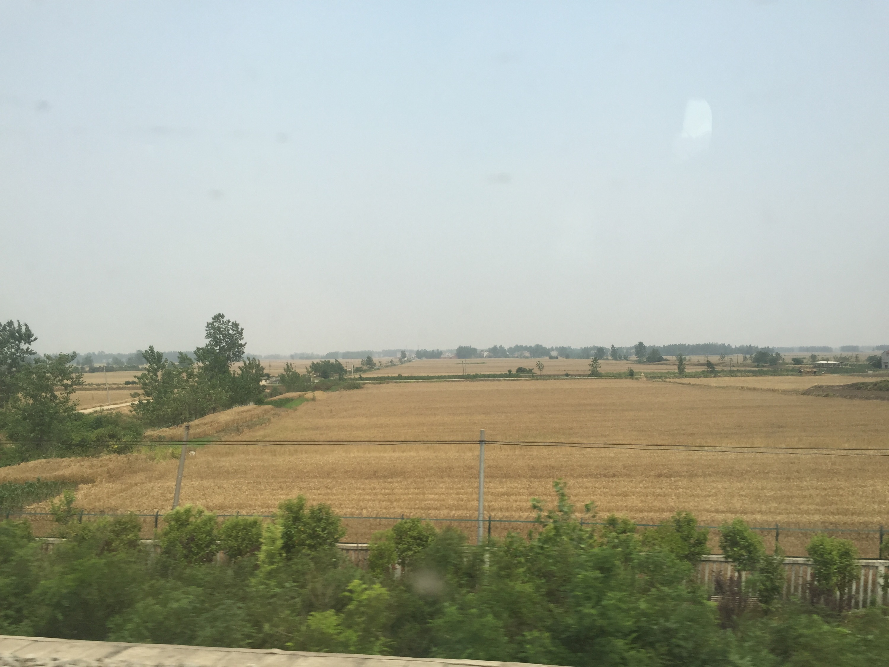 We are traveling on one of the fastest trains in China. The speeds reach 250 to 300 km/h and the fields roll past us at a great pace. We are passing through a wide valley that is farmed extensively. You can see the farmers tending to their crops their round triangular bamboo hats contrasting with the green surroundings of the green foliage. The rice fields are pools of water that stretch far out into the distance. It looks like this is a productive valley.