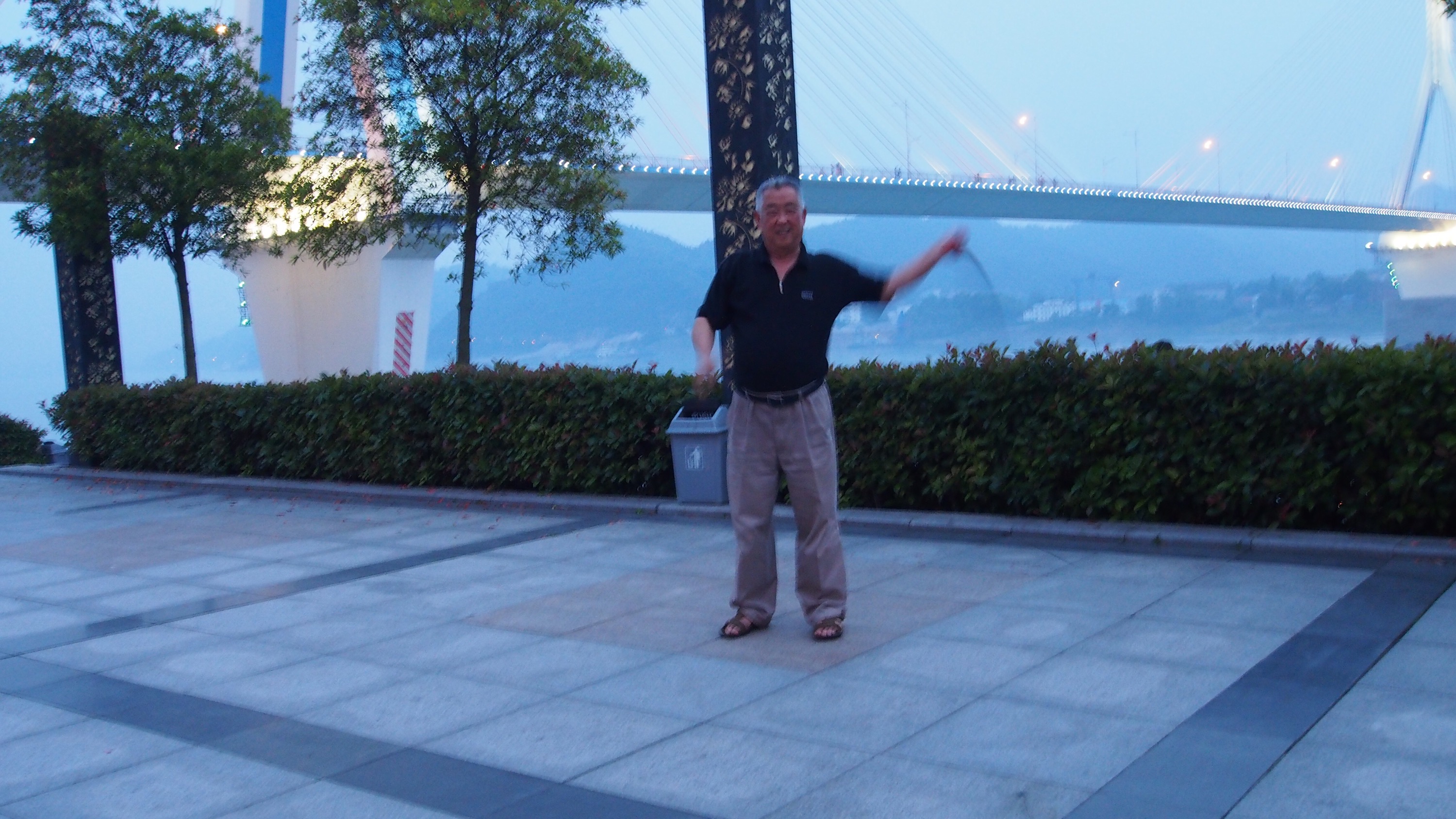 Walking back I climbed up to the walkway. The climb up from the riverbank is along what once was used as a flood barrier. Since the dam has been built that is no longer needed but it remains as a sign of what once was. I saw some people dancing in a line and the sound of what I thought were firecrackers but it was people with whips. I was watching this old man spin the whip around letting off a satisfying sound. He invited me to try it and being a beginner it didn’t go too well at the beginning. I hit myself a coue of times in the head but I did get the hang of it eventually with the man’s tutelage. There were big groups dancing further down the road in the park the video will follow later.