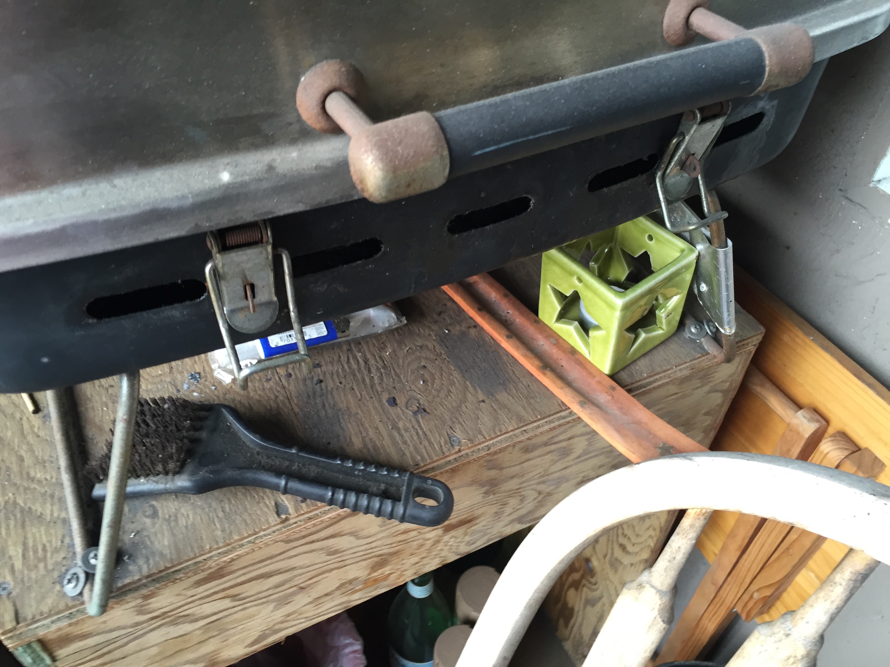 Is there anything that I could pick the lock with? Is the lock pickable? The window is locked. How much would it cost to replace? It’s double glazed might be a few quid. That’s a last resort option. Let’s have a closer look at this lock. There is a bit of a gap. I wonder if I could wedge something inside there and open the mechanism. This flat end of the BBQ brush might work. If I break it off I might be able to wedge it in there. That won’t really work. Can’t get the right angle. What about that wire from the candle holder? If I twist it and bend it into shape. There that does it. Whew! 😀😎