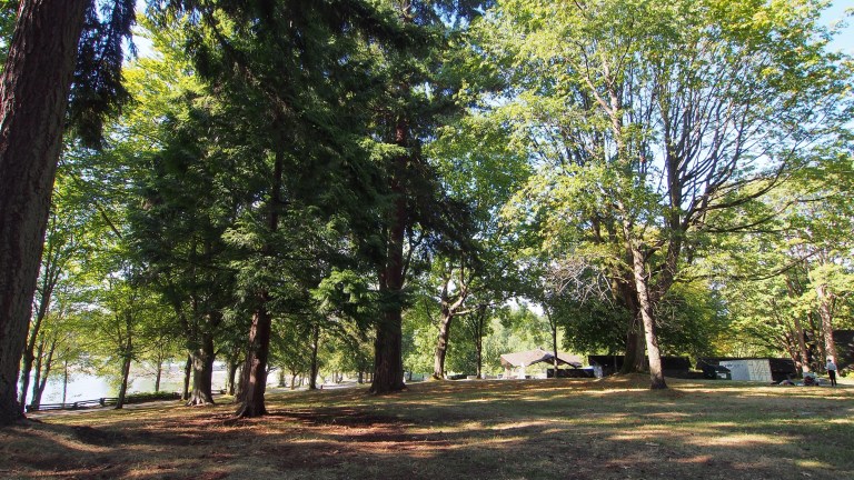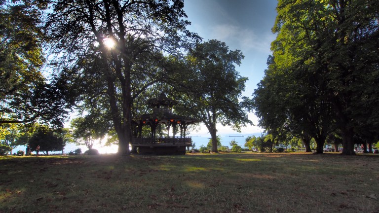 Sunlight is shining through amongst the branches of the tree. I’m sitting here on the corner of the park looking out toward the water over the patch of grass that is surrounded by the trees. There is a woman with her trainer doing a kettle bell workout. I have to adjust my gaze so that the sun shines through the sunglasses and not through the small gap in between. The crows sound their shrieks as they fly through the air and the seagulls cry their whails in the distance. It’s not much of a rush hour here close to the beach. People move about some with their dogs others spaced out as the occasional waft of pungent herb passes through the air. It’s relatively quiet here. Ships are anchored off in the distance and each successive mountain ridge is softened by the mist off in the distance. The eyes’ fidelity being much wider than the camera’s.