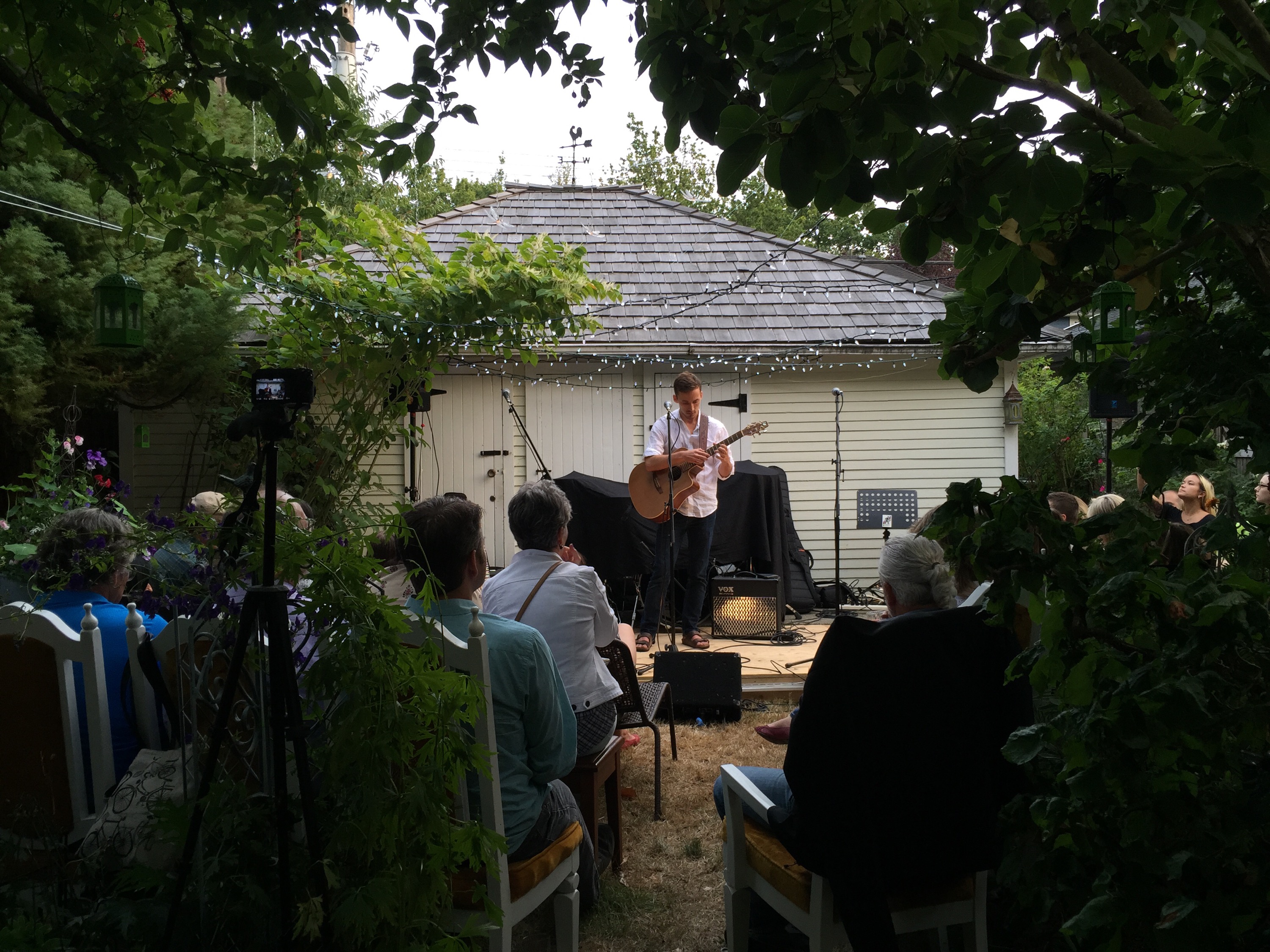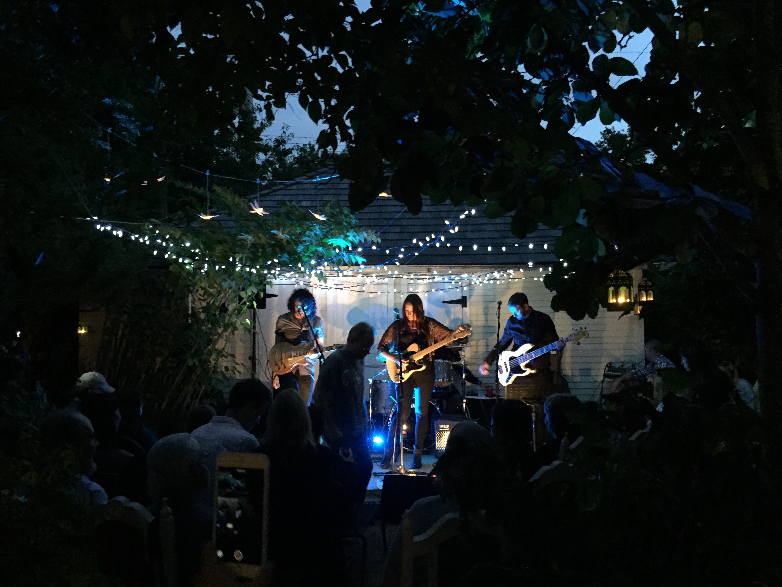 As I listened to the strumming of the first performer a calm came over me. The small audience seated under the strung out lights sat in rapt attention listening to each note strung from the string and each tap on the body of the guitar. The compositions exuded a maturity of thought and the quietness that comes from deliberation upon the state in which we live. For a young musician the music fit right in to the setting of this backyard in this neighborhood.