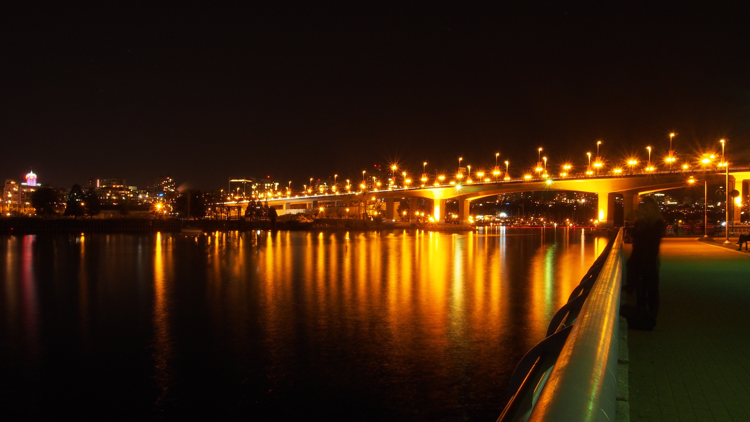 I rushed out from my workplace and made it down to the water knowing full well where the moon will be visible. I wansnt the only one who was enamoured by this sight. The railing on Cambie bridge was filled with spectators. This was going to be my observatory too but upon seeing the crowed I opted to get closer to False Creek and find a spot there along the water.