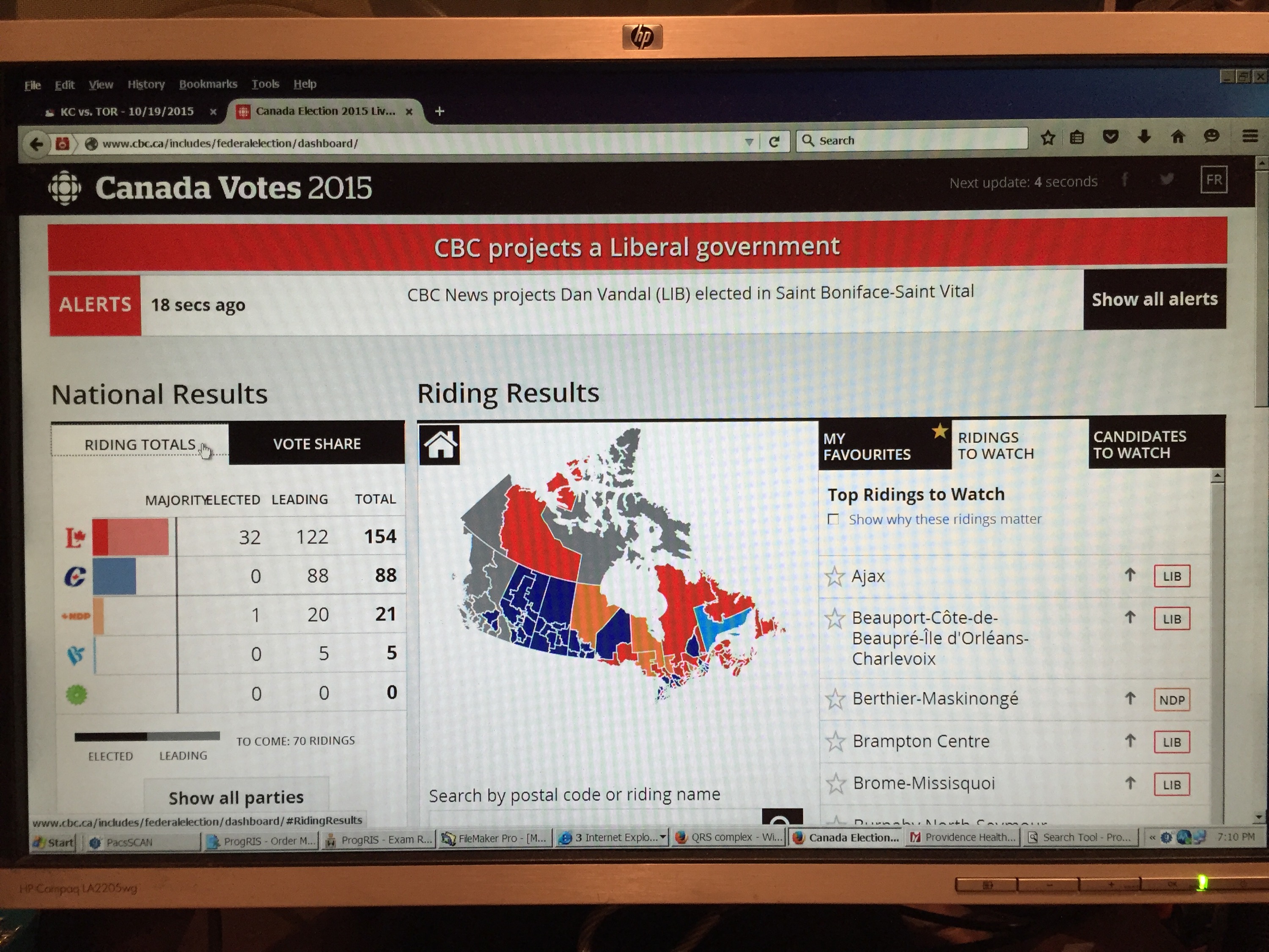 It’s a day of change and until work started I had a few hours before I had to be there. I tried to be productive and was somewhat making myself breakfast with some of the bacon I brought back from my parents house. It was my after workout meal. Before long though it was time to work. The Jays were playing trying to come back from their series deficit in order to continue their stories run toward the World Series. The other thing I followed were the results from the election. It was a busy day at work so I just watched the poll results move in. They signaled an overwhelming change. The Liberals won ushering in a new era in Canadian politics. The dollar will suffer a bit since this is the friendliest business party but not as bad as the NDP would have been. Change is not good for business since it is something new that they have to adapt to. The new prime minister is young and although he comes from a political dynasty he might be the fresh breath that this country needs. It’ll be interesting to see how he performs in the coming years. I hope it will be for the best.