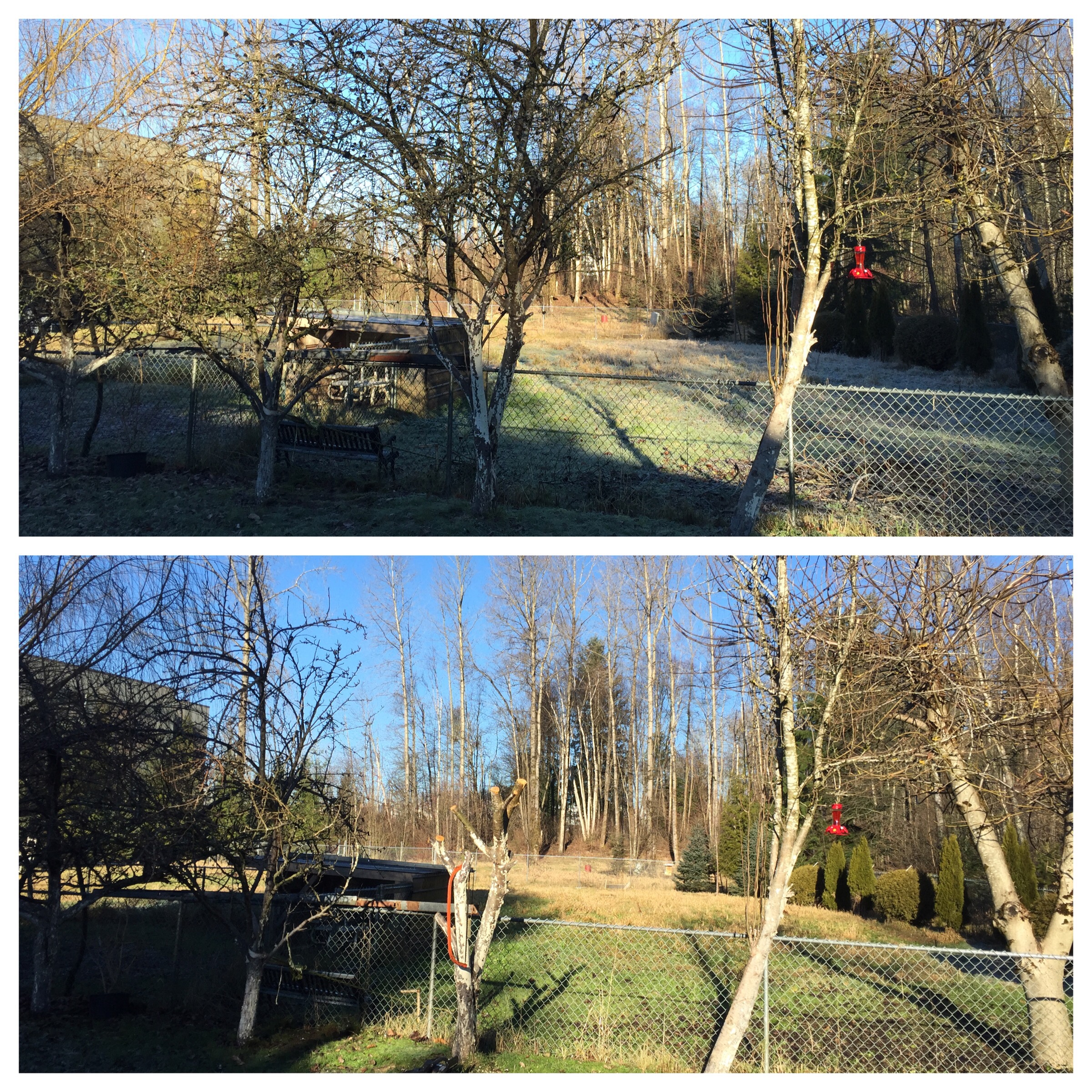 He had a few saws hidden in one of his sheds. He showed them to me as I was searching for the other parts for the brush saw. I was going to change the blade and somehow cut the remaining four branches down. I was happy to see these saws. If I had these earlier I wouldn’t of have bothered with the chainsaw. The only problem is the saw getting caught within the branch as it squeezed together. As a team I cut and he pulled on a branch in order to prevent the squeeze from happening. We were done in no time as the last branch was tackled by climbing a bit onto the tree for a good cutting angle. We then dragged the branches to the back and enjoyed the activity. This type of work helps to keep the body strong.