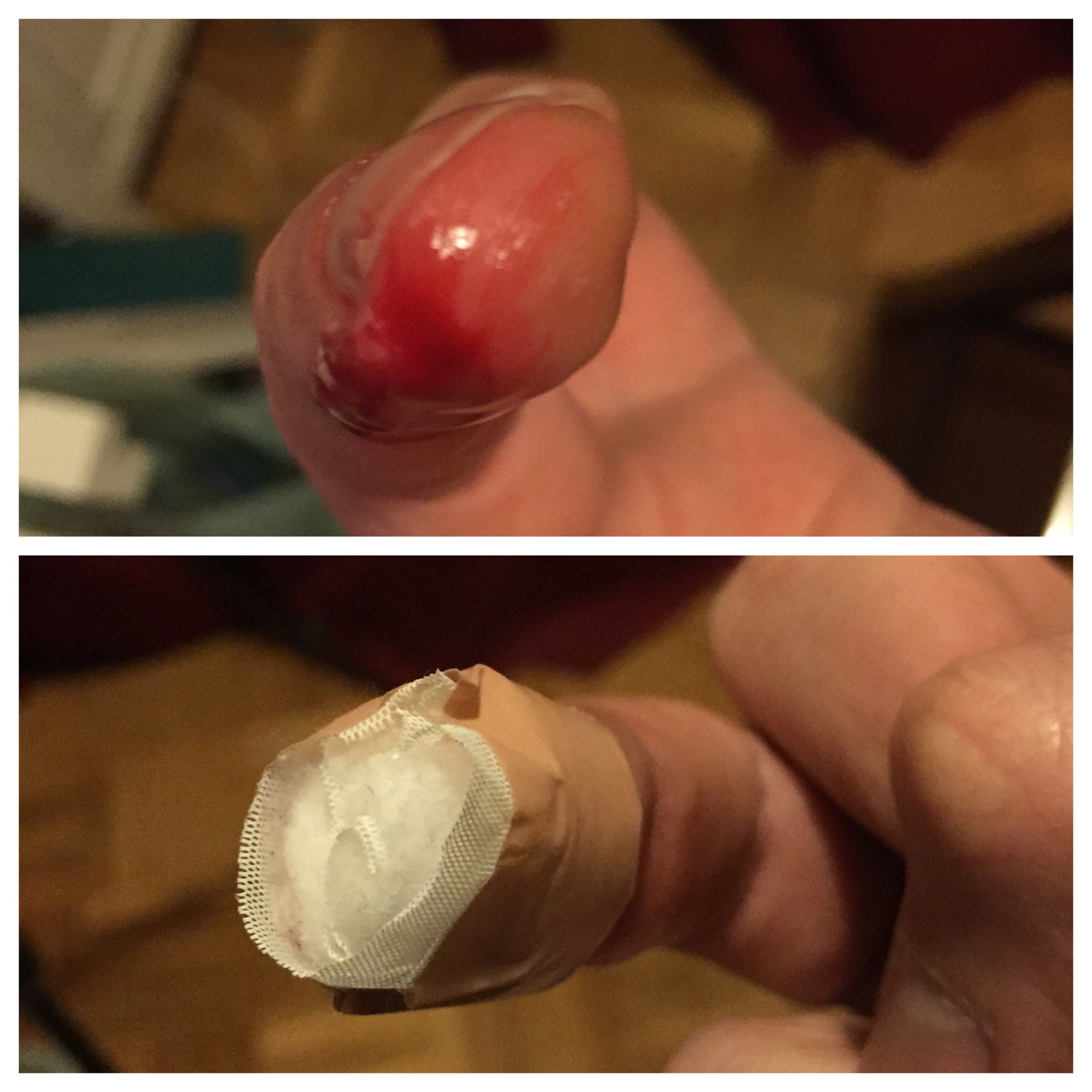 I was reaching into my change jar in order to retrieve a coin so that I could take the shoe for the tripod off in order to change the battery inside the camera. All of a sudden I felt a sharp pain and quickly jerked my hand back. What the fuck was that? it had to be somethig sharp. I sucked on my finger trying not to get the blood everywhere. It should have stopped bleeding by now. It seems a bit more serious. The blood keeps gushing out. I can feel the throbbing of the finger. The blood pulsating as the capillaries dialate in order for the rush of different agents flood the area. All these changes happen quite quickly. A temporary shock from the incursion of a foreign object through the usually tough defenses. Where are those bandages? Where are the scissors? The first bandage wouldn’t cut it at this stage. The small crisis was quickly put under control. I need tape but for now this bandage set up will do.