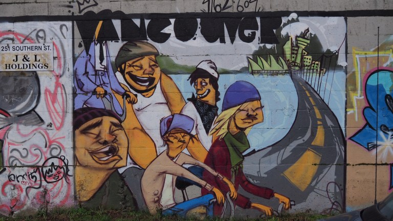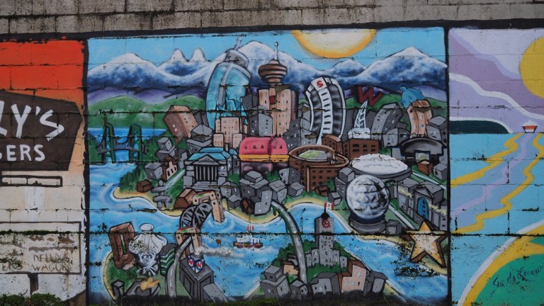 I saw some graffiti that I wanted to take pictures of by Main and Terminal. It’s not too bad of a walk to get there. It’s in an area that still maintains its industrial roots and it is cut by many rail lines. The graffiti itself was surprisingly old. A whole wall of a building covered by individual pieces highlighting some of the sights of Vancouver. It must have been some kind of project to beautify this area and prevent the rampant tagging that plagues the city.