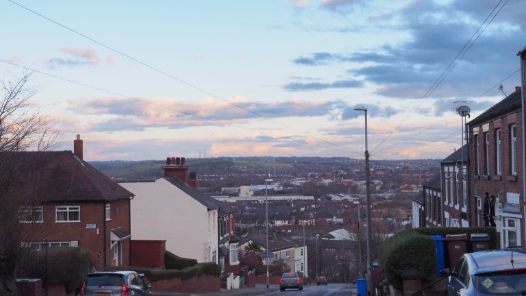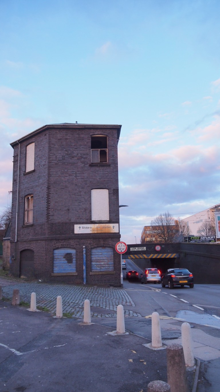 Since the day is so nice I decided to walk to the station again. I took a different route one that would not get me to the station for the 1706. There are a lot of winding roads here that are a result of the geography of this place. At one point there was a vista that I just couldn’t capture the way I wanted. I walked quickly surveying what was around me. This is an olde blue collar town that has lost some of its industry. Stoke is famous for its potteries. One day in the future I’ll have to go into the center of town to see what it’s like. For now I captured what I could.