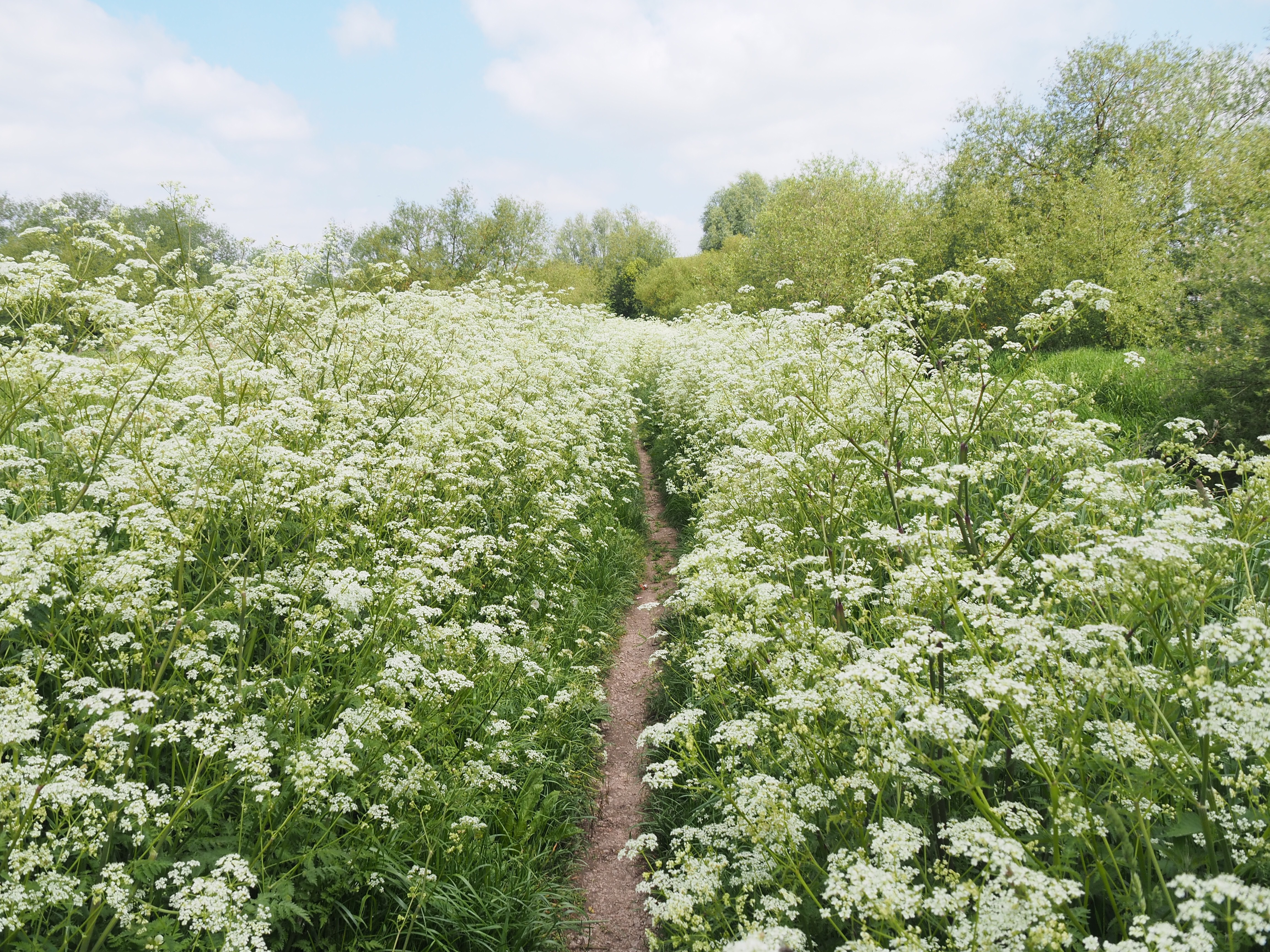 The problem with getting to the spot had to do with finding a route to get there and the other is the distance. The M6 forms the border of the nature reserve that I’ve frequented a few times already. When I first visited the water was quite high and the marsh was soggy under the feet. There hasn’t been that much rain lately and as I made my way to the start of the trail the waters appeared to be much lower than before. Grasses have grown quite high obscuring some of the narrow lanes that have been trampled along the creeks connecting all the various waterways that criss-cross this area.
