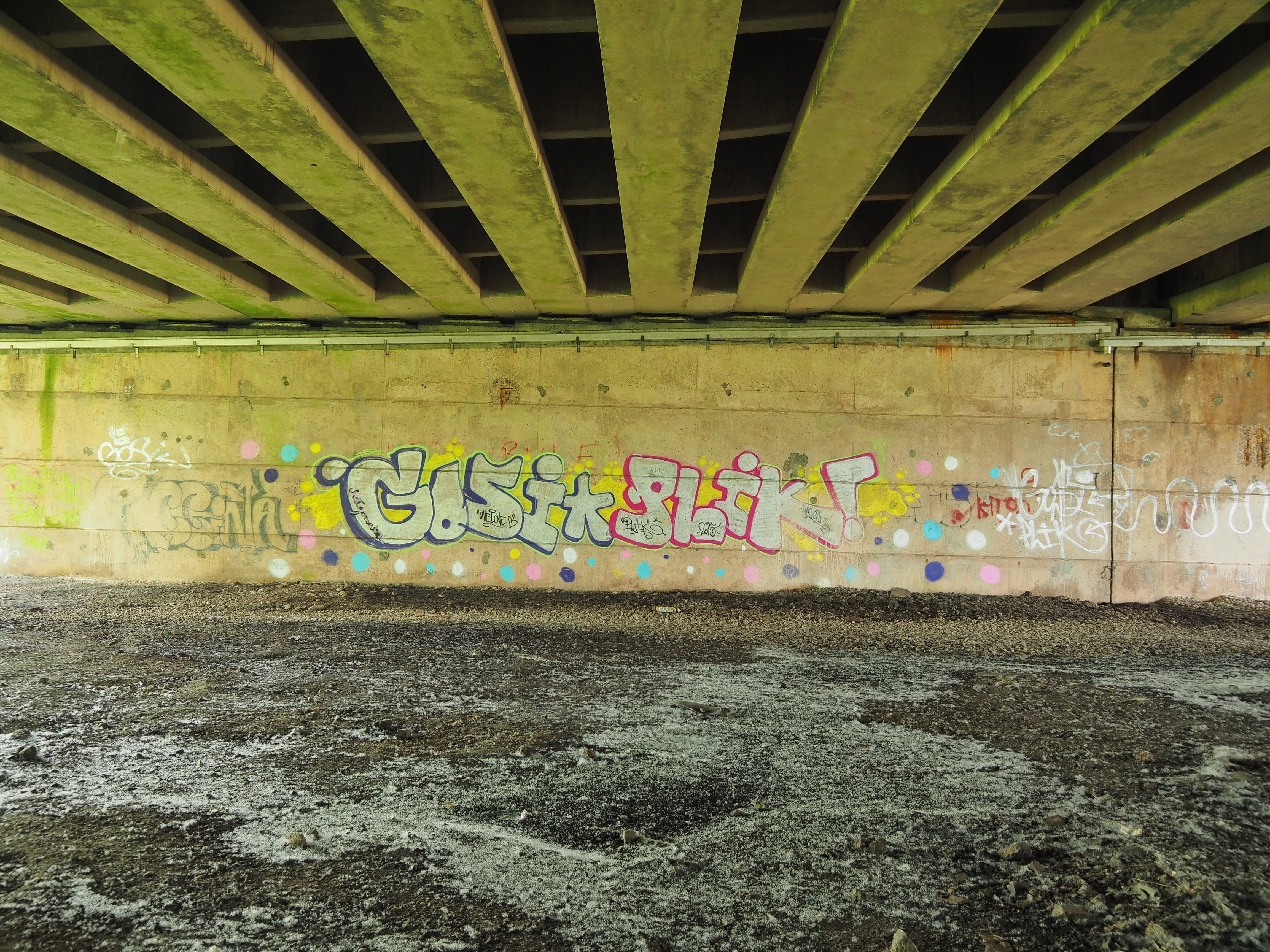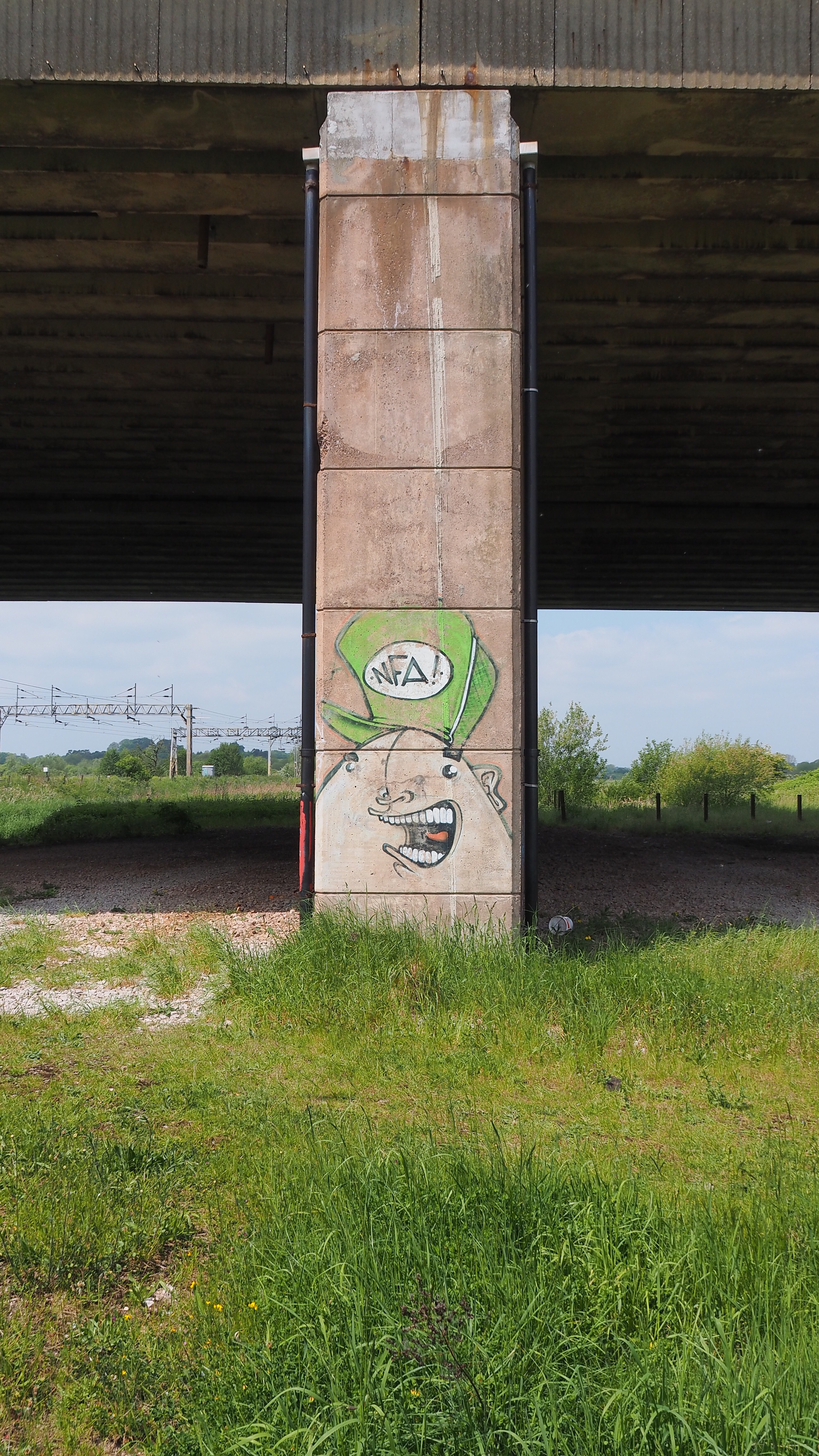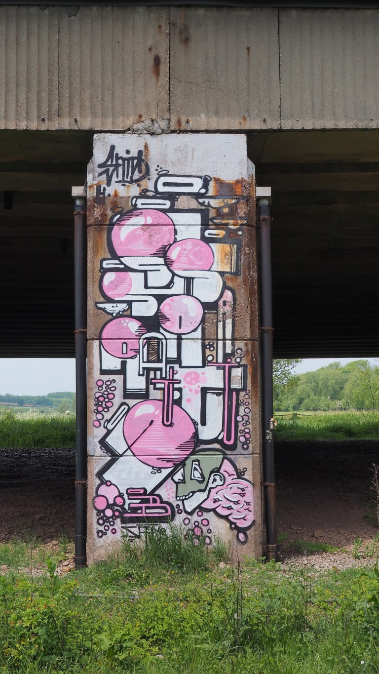 The M6 is a motorway or a highway and is the longest one in Britain. My train passes under it as I leave for work in the morning and when I return in the afternoon. Ever since I got here to Stafford I’ve noticed the graffiti scrawled on the walls some of it two stories high and I made it a point to one day explore underneath. I tried to get here before but never found a path of the energy to do it. This day however I was determined.