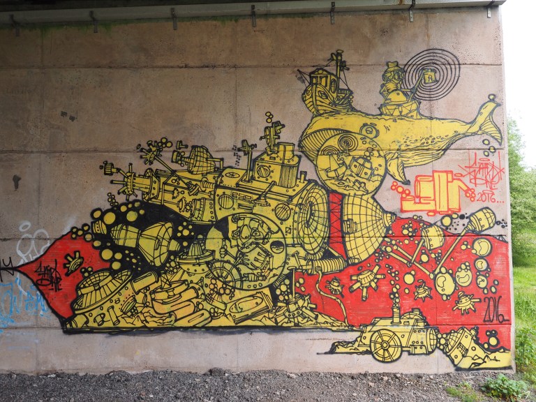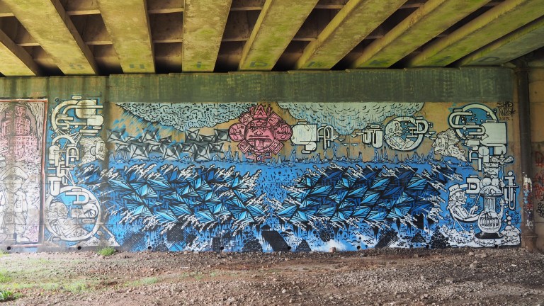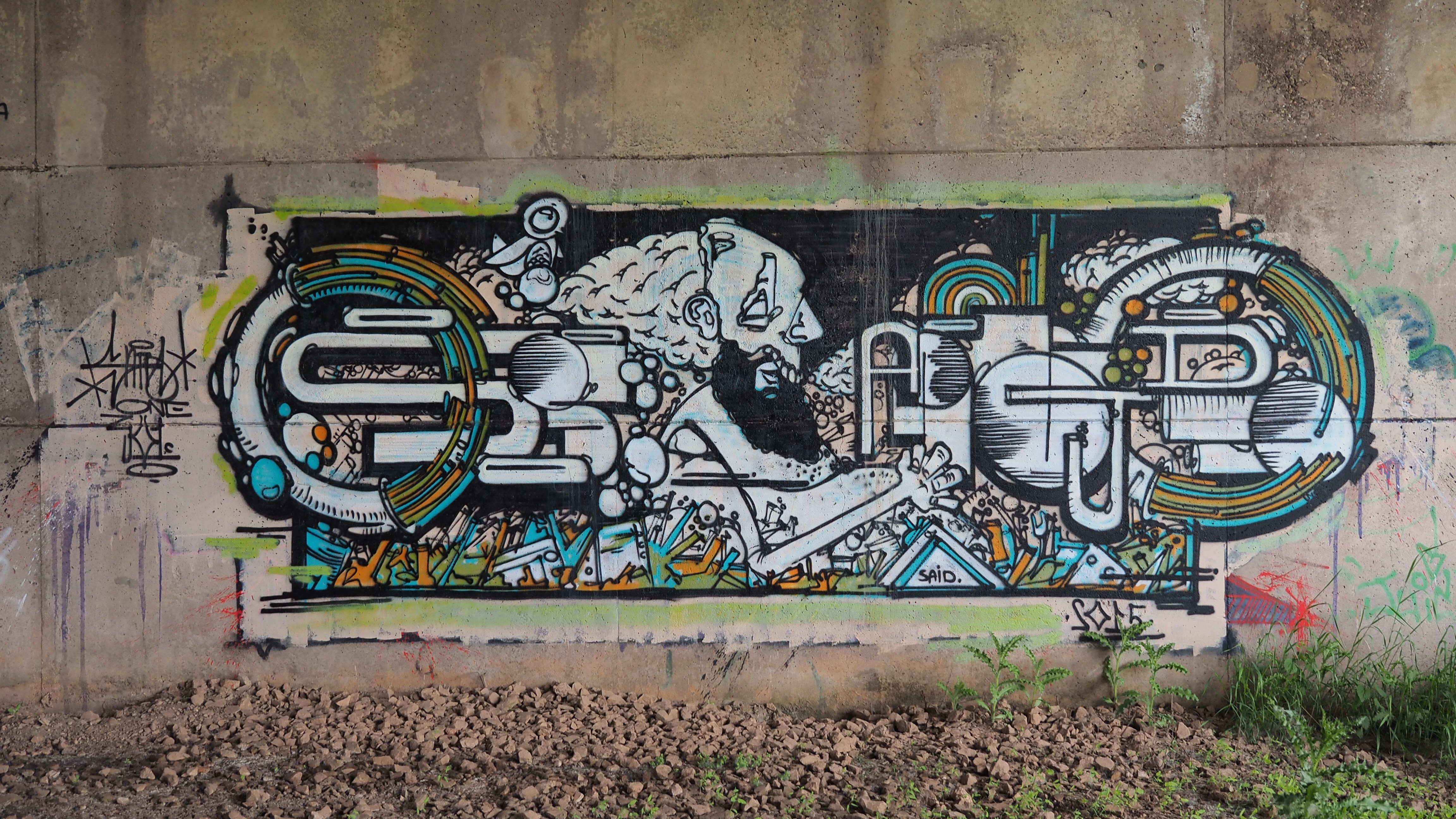 The tracks lay beyond the wall and the waterway. I had made it as far as I could and it was the space that initially inspired me to come here. There were giant letters and a relatively small intricate mural in the corner. It’s the one that I saw from the trains. Having seen the others it wasn’t as impressive but it would have been impressive if the others weren’t there. If you know what I mean.