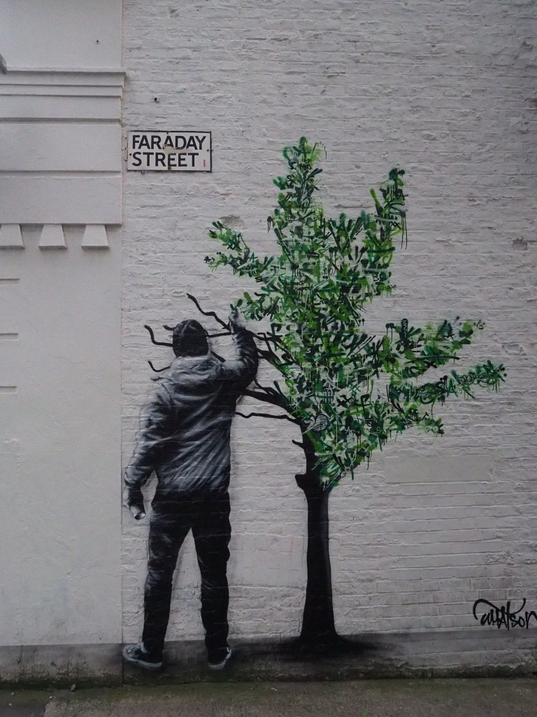 As some of you may have noticed I am a fan of street art. Expression that is painted on walls accessible from the street. Graffiti, stencils, stickers as well as any combination of the above. Currently there is a street art festival happening in Manchester in the Northern Quarter of the city. These murals by invited artists from around the globe are meant to draw attention to various issues facing our society. These issues range from equality to the abolition of violence while at the same time expressing feelings about those subjects. These feelings are conveyed through visual form in a medium that is more in tune with today’s fickle disposable culture.