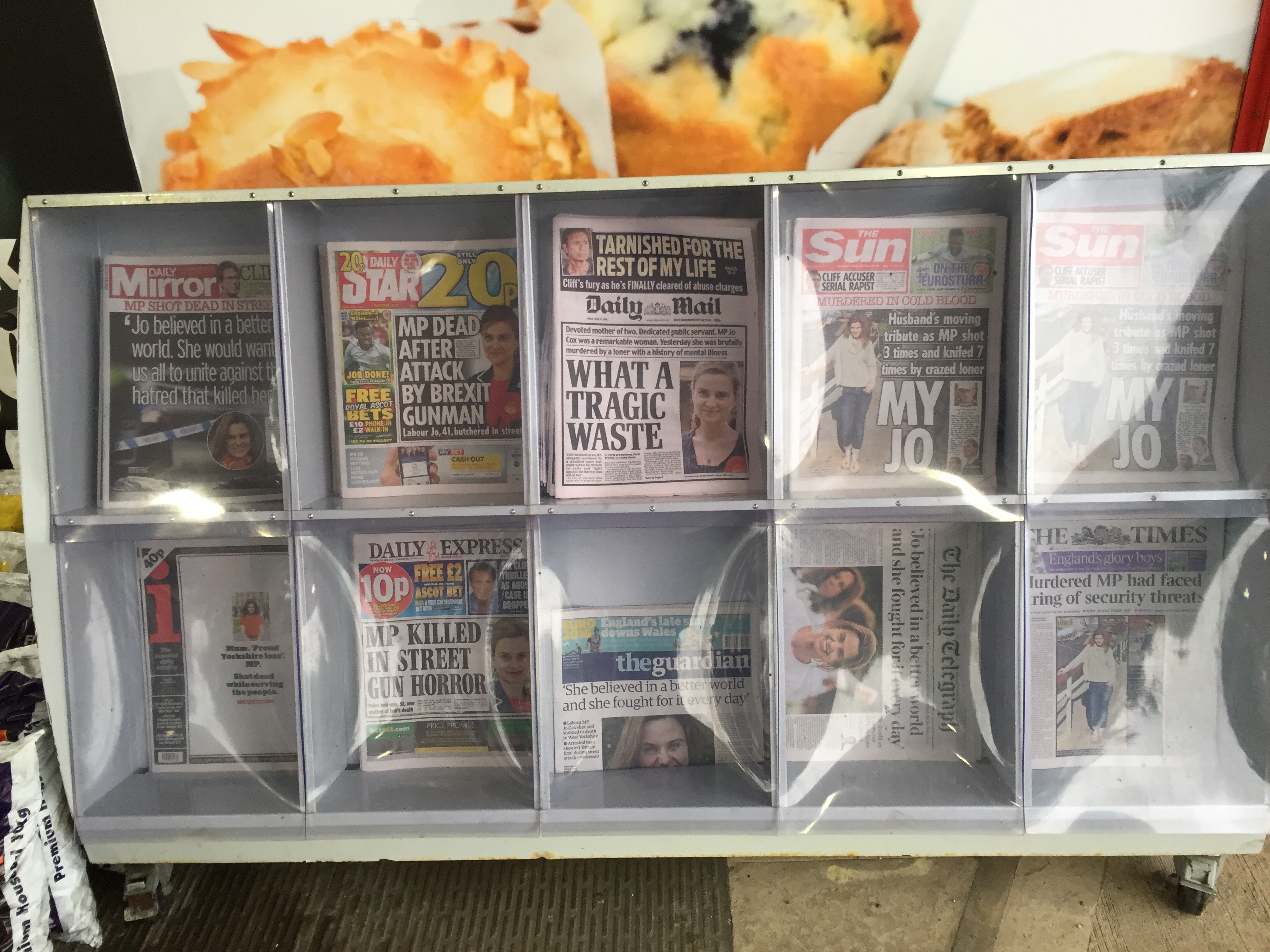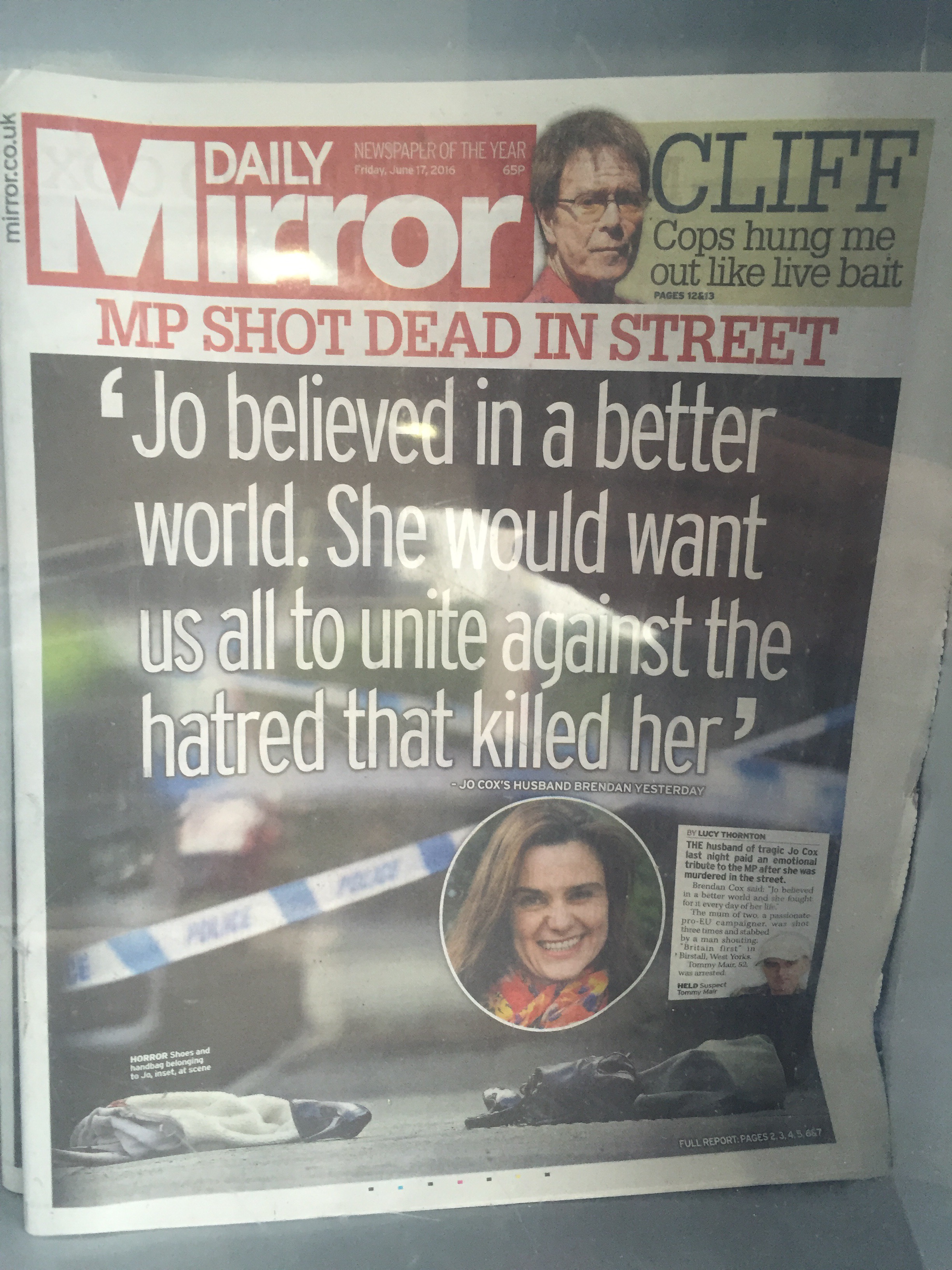 On my way home as I tried to look at the highlights of the game to see the way in which the win was secured for England the headline wasn’t the victory but the tragic news that a Member of Parliment was shot and stabbed to death outside her surgery. She was killed as she was meeting with her constituents in her hometown that she represented by some man. By the time I got to my flat the news of her death was broadcast with the immediate shock and reactions from her colleagues on both sides of the political sphere. The man supposedly shouted “Britain First” a reference to a right wing nationalist party. She was an ardent Remain campaigner.