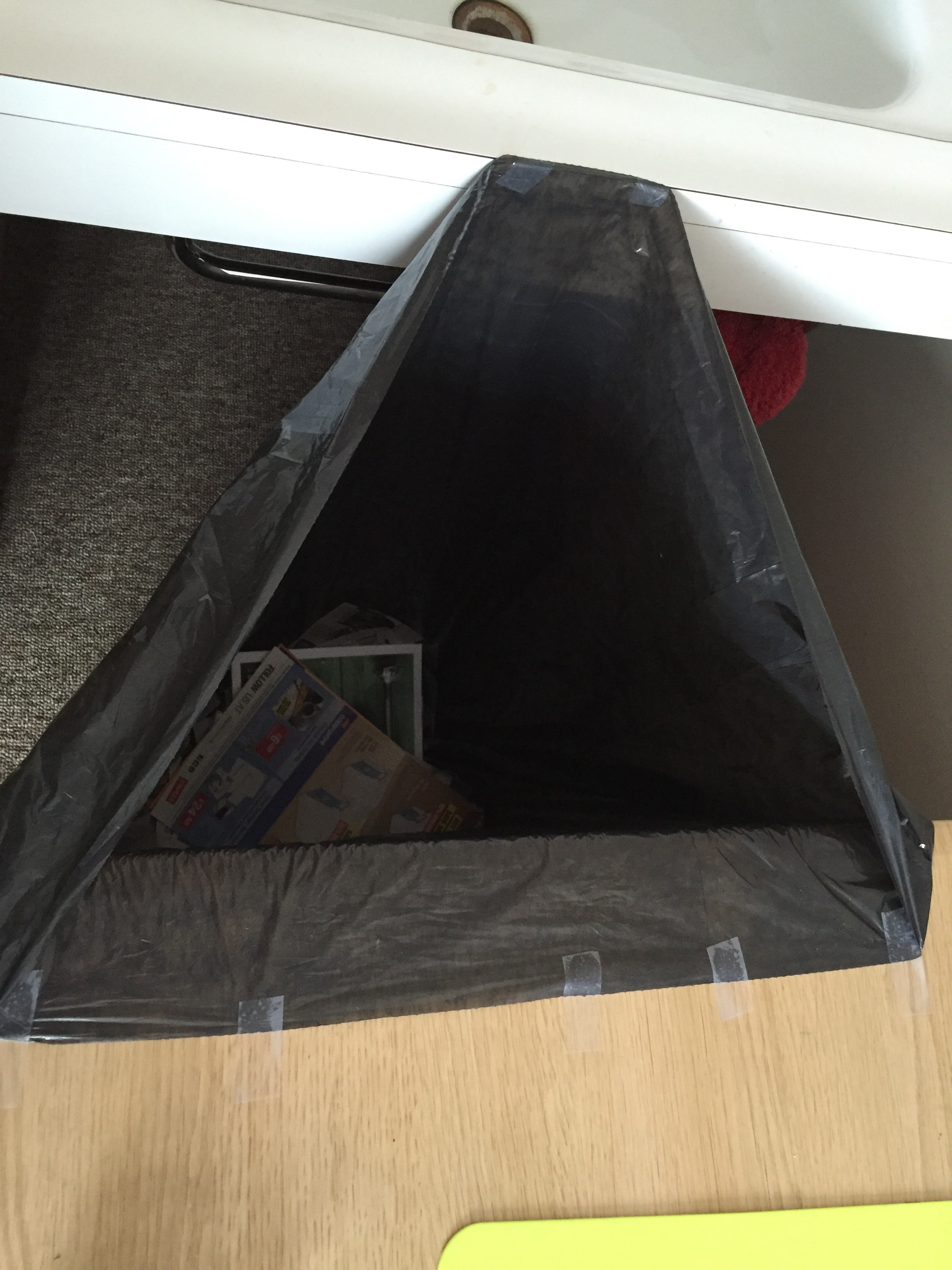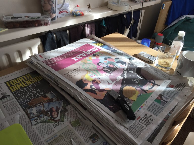 It was time to get down to business. I set up with a bin bag taped to the edge of my desk for easy disposal of the used newsprint. I put the sports section on top of the desk to protect the surface from errant cuts. I don’t want to damage the surface of the desk. There is a damage deposit to think about. This project is costing me time don’t want it to cost me money too.
