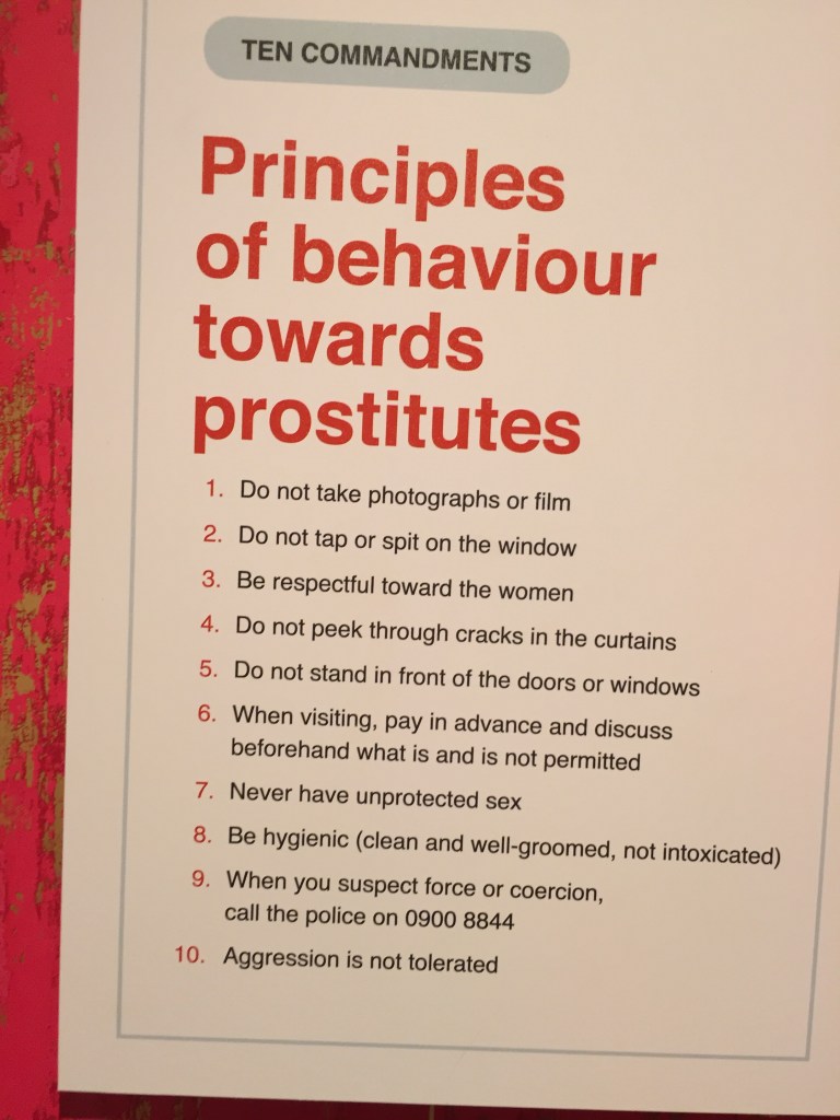 As we made it through the narrow halls we were shown a short film that was on loop showing a typical day in this area. What do these women do with the rest of their day? Why get into this work? This place is what it looks like behind the window. There is a bed, showers, and a bathtub. There were examples of fetish gear and a description of how it is used. There are also many little vignette story and information plaques. Things like how much they make, how much it costs for the space, how long a typical session lasts. The whole presentation laid it out in a matter of fact way. There is a need that these women are fulfilling and the government of the land chose a long time ago to regulate it somewhat and thus provide a safer means for providing their services.