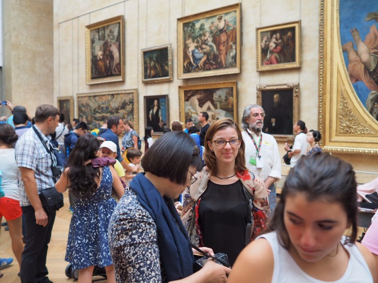 Outside the weather was hot. We sat there after eating contemplating our next move. The museum is truly massive. To walk through all of the rooms housing the exibits would take you on a twenty-six kilometer odyssey through time and space. It is too much for one day. We wanted to find the Three Graces a favorite theme in Chrl’s art appreciation and to find the rest of the Da Vincis. Chrl has been keeping track of where we’ve been on the map. With access to the interwebs we were able to plan the course of our assault. We were close to some of these pieces but just got distracted and moved in a different direction.