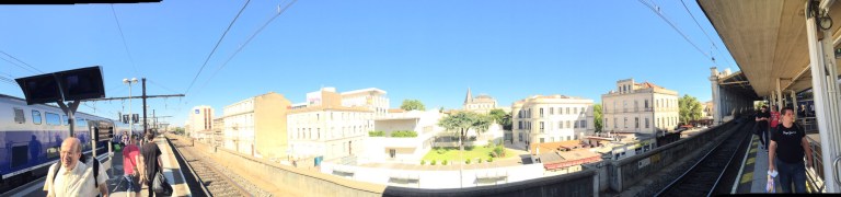 Just finished a sandwich that we bought in Paris yesterday in preparation for this journey. There is a car where one can purchase some food and drink but it tends to get expensive buying food like that. I suspect that I’ll be visiting there a bit later to get some more food later. For now the water, juice and coffe will suffice. We are slowly approaching Montpellier Saint-Roch where I will again stretch out my legs.