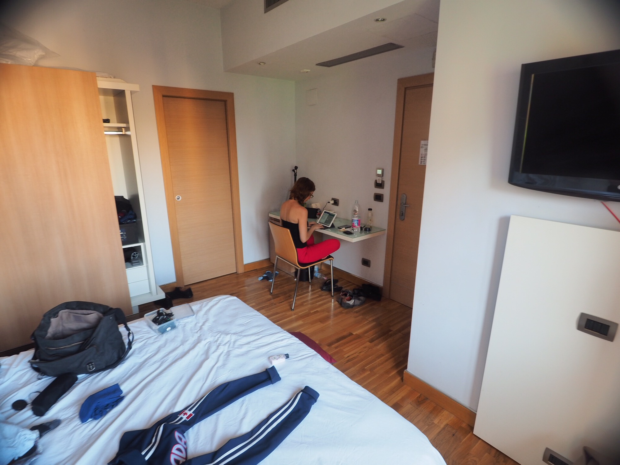 We stopped off at some pizzeria along the route back to our hotel. The pizzas here have been really tasty. The crust is thin and the traditional way of topping them differs from the North American style that has developed there and that I’ve grown up with. We couldn’t of have had a proper experience here if we didn’t have any of the traditional foods that have originated here. After the meal at the hotel it was time for Chrl to focus and finish her paper. As she worked I worked on my project. With so much that has happened these posts have grown in length. At some point they will have to be edited as they are just a flow of consciousness typed into the screen. As the hours dragged on Chrl employed me in proof reading her paper. I must say that her paper read very nicely and my reading helped to catch those annoying errors that crop up and to help shape some sentances that didn’t. Before we knew it it was already getting dark.