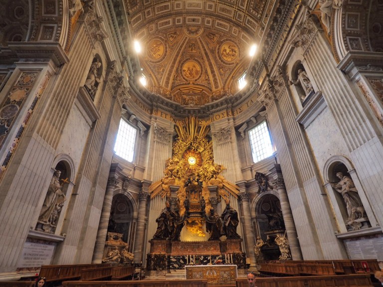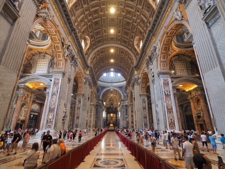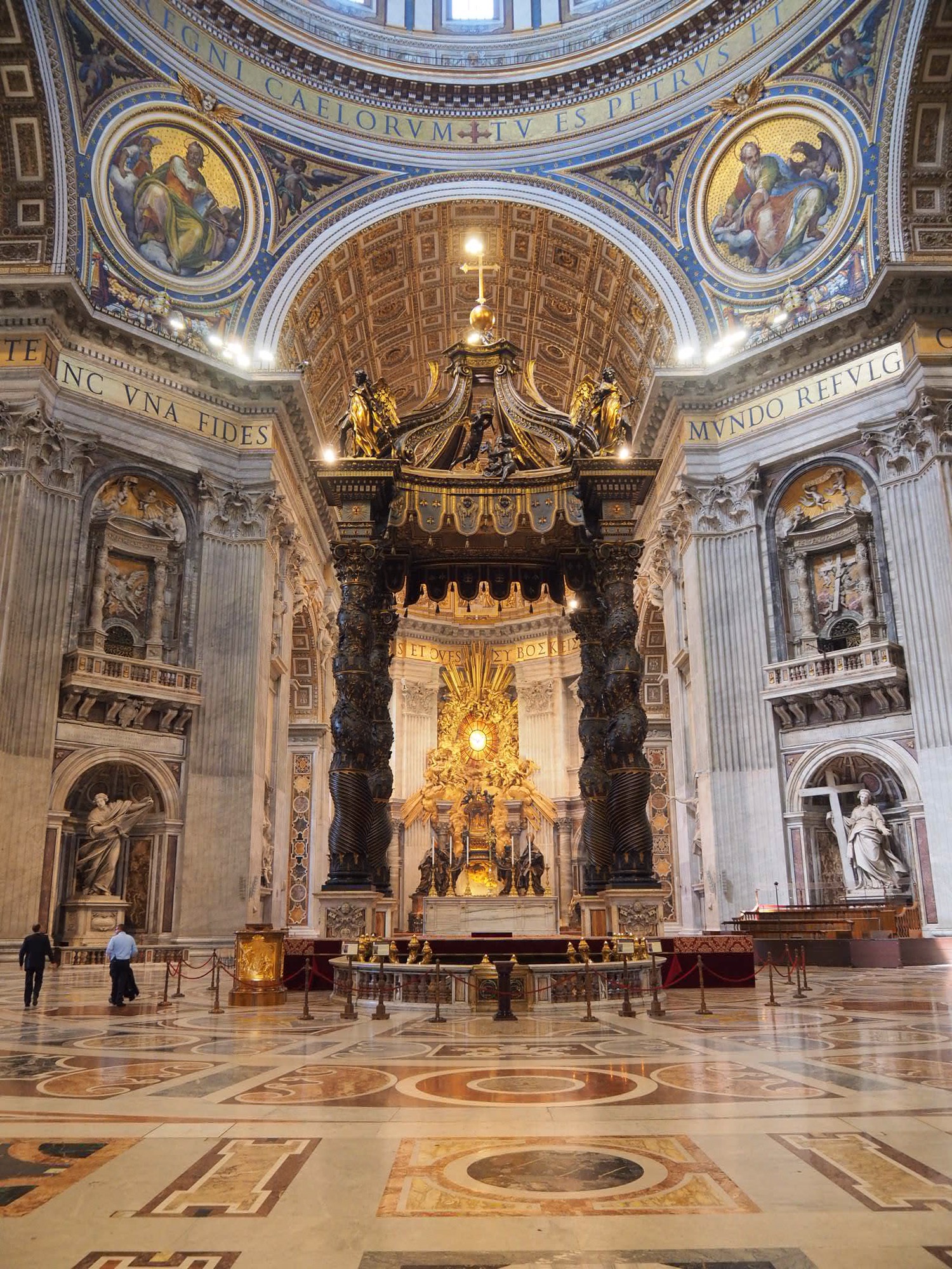 Outside the temperature close to high noon was about 30C. The square wasn’t packed and there was no altar set up in preparation for mass. It wasn’t clear if the pope was going to actually going to appear. I noticed that the line up to get into the basilica wasn’t long. The sun was quite hot and I suggested that we go inside and check it out. Along this journey we have visited many churches. This is one of the most important ones in Catholicism. It is the seat of the bishop of Rome and it is quite a magnificent structure. We both would like to see what it looks like inside.