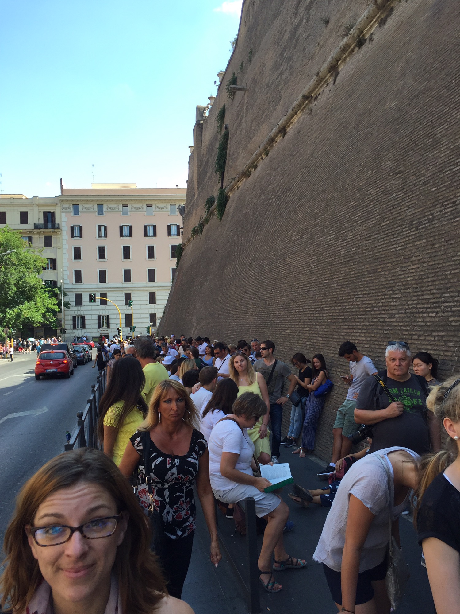 The entrance to the museum and the Sistene Chapel is on the other side of the Vatican. We had to cut through St Peters Square and go around the back following the sidewalk that ran along the tall imposing walls that surround the Vatican. The crowds kept getting thicker the closer we got to the entrance. The end of the line for people without a ticket was far away from the entrance. This was by far the longest line up we have seen on our journey. Since we had a ticket already bought and printed we walked past this line and entered the museum unencumbered. Inside we found a general map and made our way to the starting point. This was a heavy tourist day. It must be like this always here. September is supposedly the busiest time in Rome. So it must get worse.