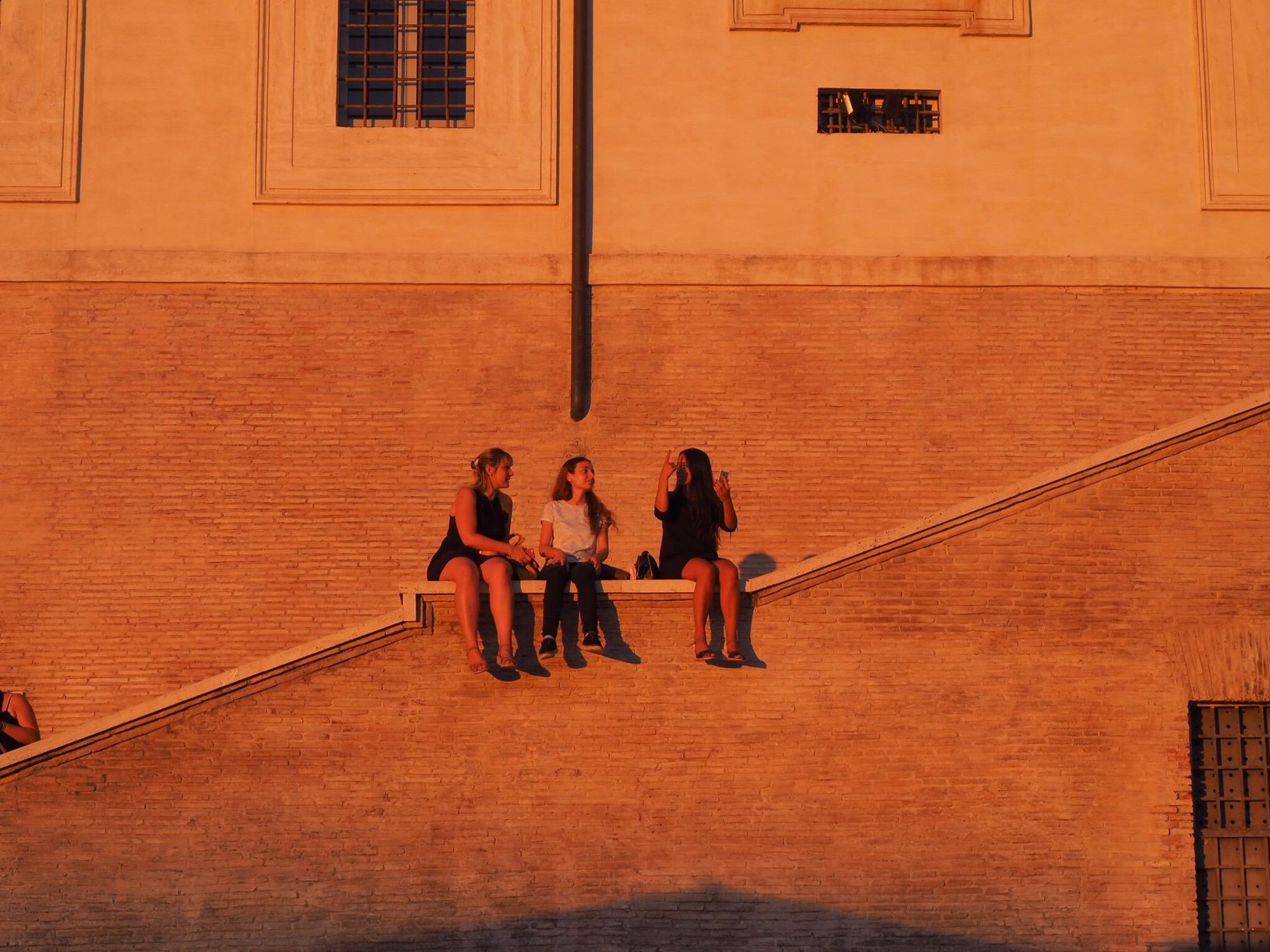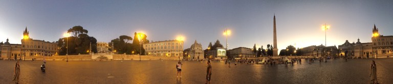 As we continued north the perspective of what we saw changed depending on the amount of foliage growing from the earth below this rampart. The sun finally set and we continued toward the People’s Square that houses one of the oldest obelisks in Rome. This is a big area that served the people of this city since it was created. The steps down to the square were quite slippery and we had to take them cautiously. We saw one woman slip and on the bottom a young girl sat crying holding the back of her head being comforted by her family. How many billions of people must have walked up and down these stairs over the years. It’s quite something to think about.