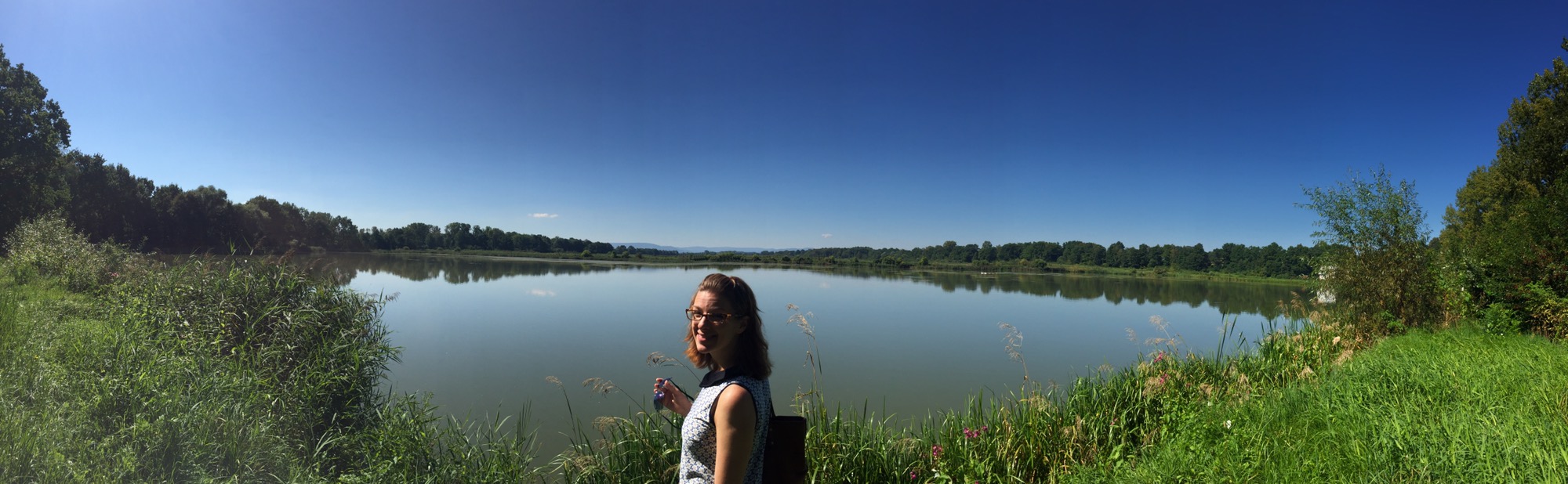 By this time in the morning the house was up and people were on their way to their activities. Klaudia had to be driven to Oświencim for her practicum by Konrad. Joasia was helping my aunt Irena while getting breakfast ready for all of us. She had to get to her duties at the cultural centre. We were going to go for a walk around the village. She put on that dress from Barcelona that looks so good on her. We brought hot temperatures with us and after a quick snack we walked down this incline towards the ponds. Back in my youth this area looked different from now. To me back then this hill was daunting. Now it is just an incline easily traversed without breaking a sweat. There is an old house far from the road behind the thick foliage. Across the road is where the former farm machine yard was. It’s where my aunt and uncle worked partitioning the machines and other supplies amongst all the villagers. People don’t farm their plot of land anymore. Someone rents and works the land from them now. We turned left to walk by the ponds.