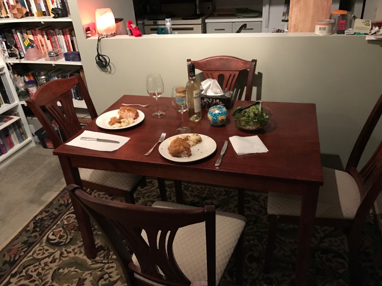 I have just recently started a new job. This kind of plays against me regarding the timing of dinnertime. The menu for tonight’s dinner called for chicken cordon bleu with baked potatoes in a garlic and herb sauce as well as a salad. I had all of the ingredients pre-purchased so that I could start on dinner right away. I haven’t made all of the pieces of the dinner before. The chicken seems easy enough, the potatoes will take the longest so that I will make them first. I didn’t think that the workday will take so long. One of the presenters came dressed in a valentine patterned shirt as an homage to this day. I rushed to the liquor store in order to get some wine for tonight’s dinner.