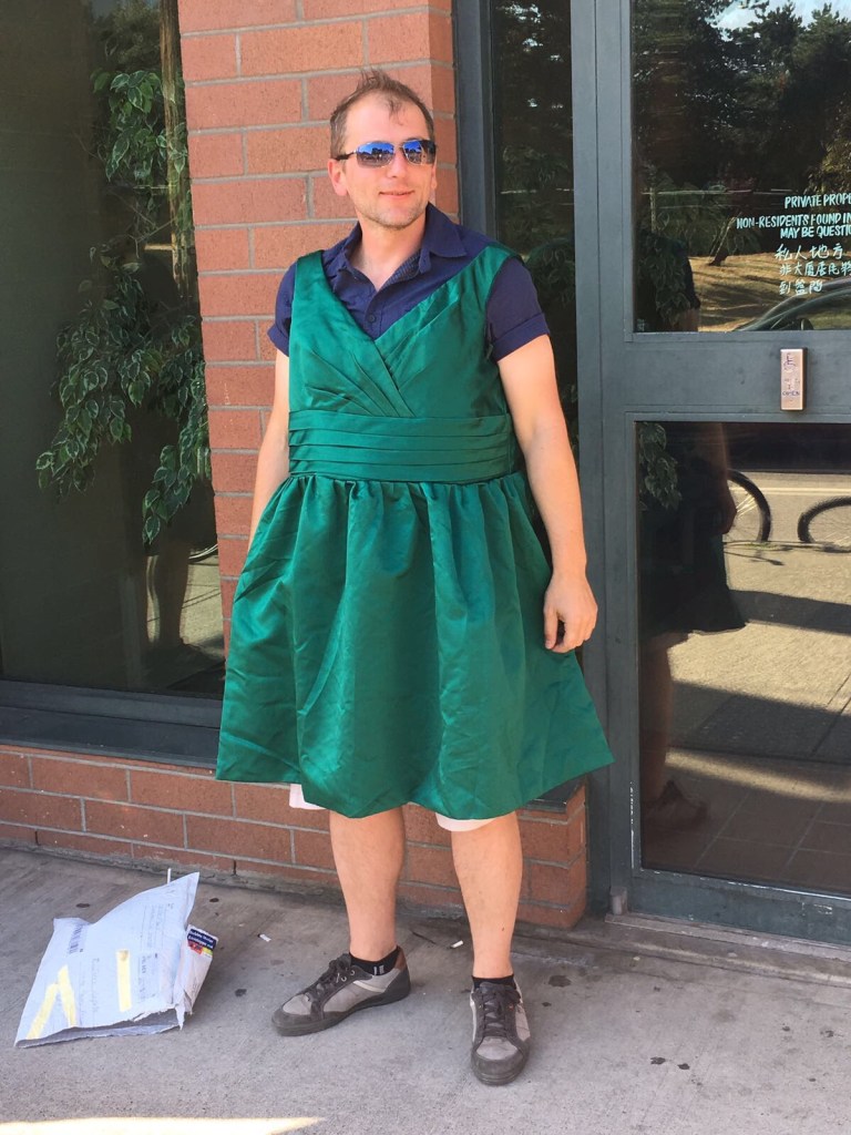 The package contained one of the failed bridesmaids dresses. He wanted me to put it on and wear it for the rest of the night. I am not a big fan of these kinds of rituals especially since this is my second one of such celebrations. The dress itself was supposed to be satin but it felt really thick and it was pretty loose on me. There was now way in hell I was going to wear it. I mulled it over in my head and decided to humor the guys by putting it on. It is kind of funny to be standing there with it on. They certainly got a huge laugh out of it. I ripped the dress off to make sure that I would never have to put it on again.